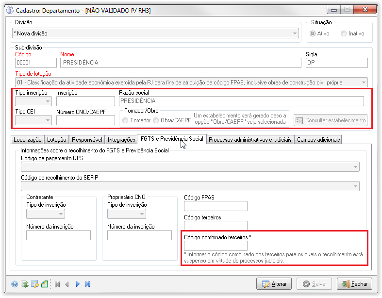 | Código combinado terceiros | Facultativo | Identifica, em cada lotação tributária, quais são os terceiros (entidades e fundos) que têm suas contribuições sociais suspensas por medida judicial. |