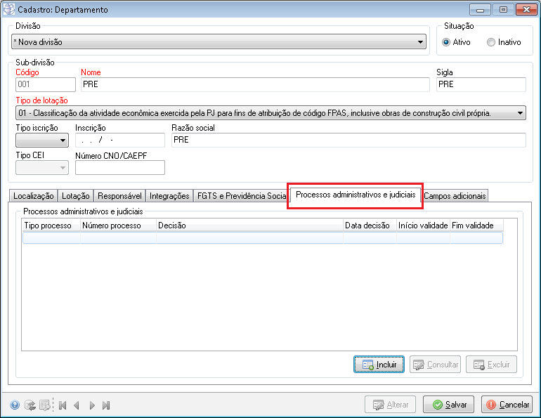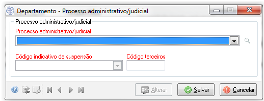 | Processo Administrativo/judicial | Obrigatório | Informar um número de processo judicial cadastrado |