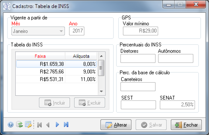 Caminho:Folha de Pagamento ⇒ Tabelas\ Previdência Social (INSS)