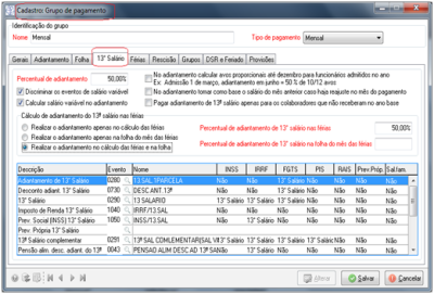 Acessar o Menu: Tabelas>Grupo de pagamento>Aba 13º salário;