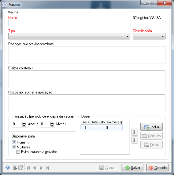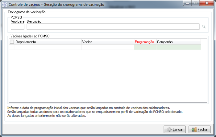 Caminho | Segurança & Medicina do Trabalho→ Tabelas→ Vacinas; Segurança & Medicina do Trabalho→ Medicina→ Controle de vacinas; Segurança & Medicina do Trabalho→ Medicina→ Geração do cronograma de vacinação. |