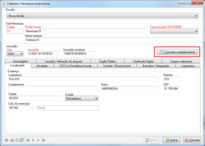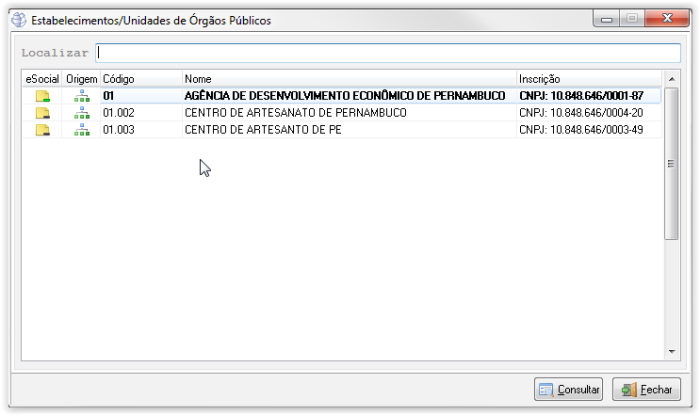 Descrição | Com o intuito de adequação ao eSocial, foram efetuados os seguintes ajustes no sistema: Estabelecimentos de ensino O campo Inscrição, quando for um CNPJ, será de digitação obrigatória. Para mais informações sobre esta funcionalidade, clique aqui. ![]() Hierarquia empresarial Foi incluído o botão Consultar estabelecimento. Para mais informações sobre esta funcionalidade, clique aqui. ![]() Departamentos Foi incluído o botão Consultar estabelecimento. Para mais informações sobre esta funcionalidade, clique aqui. ![]() Estabelecimentos / Unidades de Órgãos Públicos Foi incluído este novo cadastro que exibe os estabelecimentos ligados às hierarquias / departamentos. Para mais informações sobre esta funcionalidade, clique aqui. ![]() ![]() |