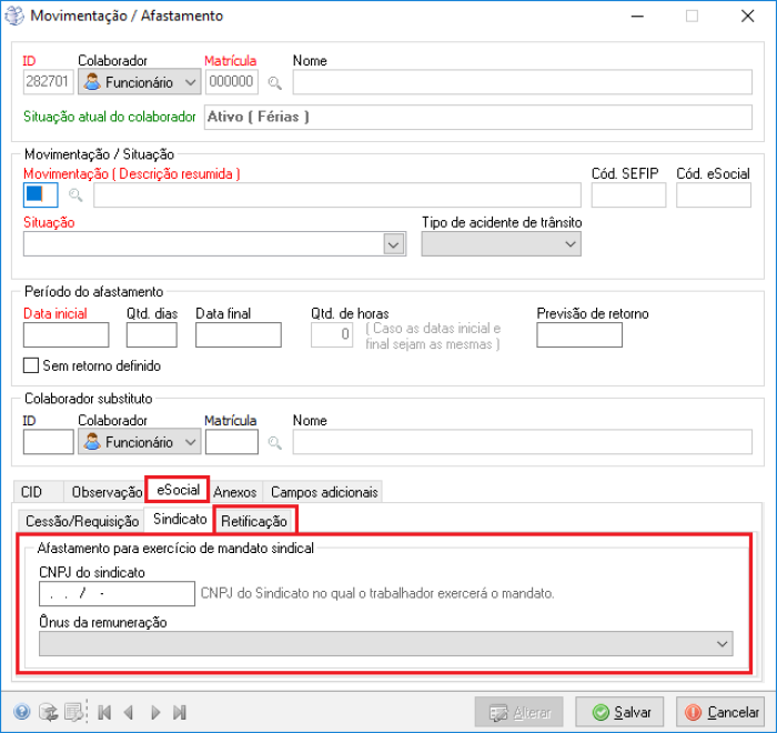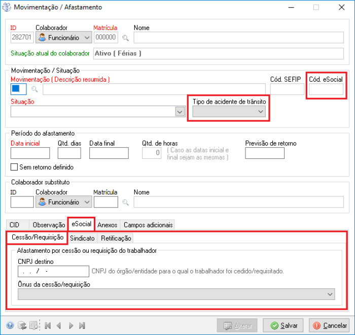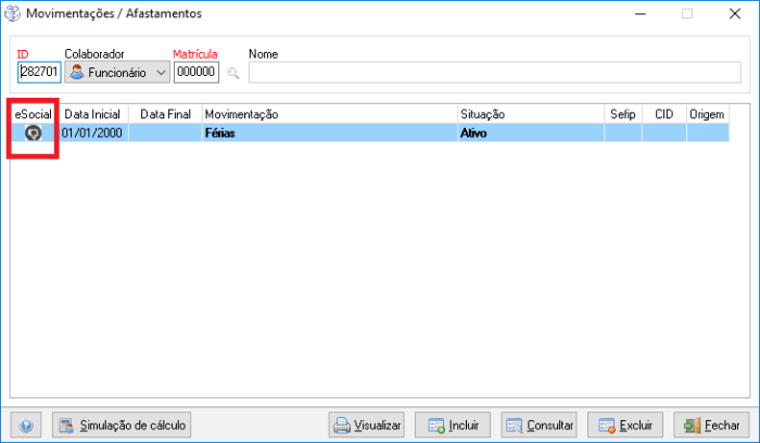 Caminho | Folha de pagamento→ Movimentações→ Movimentação/Afastamento. |