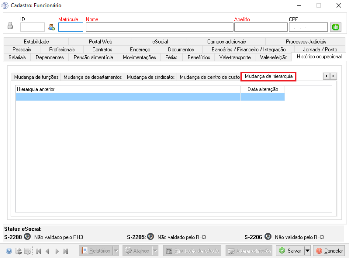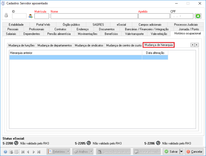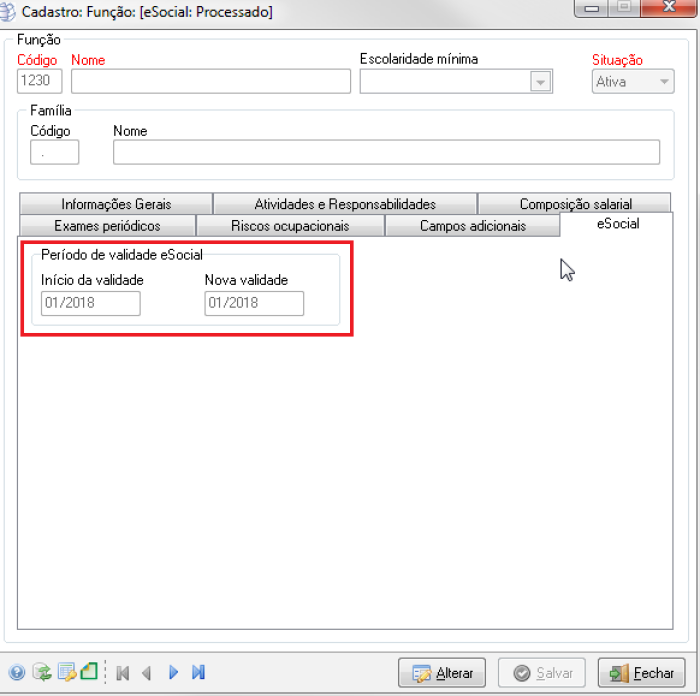 Descrição | Em vários cadastros do sistema foi disponibilizada a possibilidade de configurar a data de início e validade do eSocial no ambiente de produção. ![]() ![]() ![]() ![]() ![]() ![]() ![]() ![]() Nota: Para mais informações sobre a regra destes novos campos, basta acessar o manual do usuário de qualquer uma destas funcionalidades, como por exemplo: Cadastro de Cargos. |