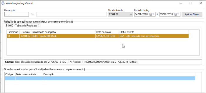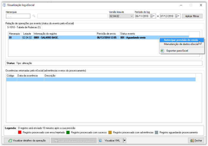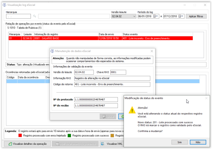 Descrição | Com o intuito de ampliar e otimizar a experiência do usuário, o RH3 passou a exibir registros que foram retornados pelo eSocial com código de resposta iguais à 202 (processados com advertências) de forma destacada. Dessa forma, é possível identificar, com mais clareza e velocidade, todos os registros com advertências do eSocial, para análise e conferência. ![]() Com esta nova mudança, é possível identificar os 4(quatro) status de retorno mais importantes do eSocial: • Processado com advertências. • Processado com sucesso - Nesse status, quando o eSocial confirma que a informação está validada sem nenhuma advertências, as ocorrências anteriores deixam de ser exibidas. O intuito é otimizar e facilitar o entendimento dos usuários. • Aguardando processamento. • Processado com erros/rejeitado. ![]() A tabela (grid) de operações - Relação de operações por evento (status do evento pelo eSocial) - ganhou uma nova funcionalidade com a finalidade de gerar mais conforto, segurança e agilidade na manutenção dos dados atuais do RH3 e seus correspondentes no ambiente nacional do eSocial. O menu suspenso (acessado através do clique do botão direito do mouse em cima de um determinado registro) abre duas novas possibilidades ao usuário: a antecipação da previsão de envio e a manutenção dos dados eSocial. ![]() Antecipar previsão de envio Esta opção permite que um registro que acabou de ser gerado pelo RH3 (informação que foi incluída ou modificada) e que ainda está com o status “Aguardando envio”, tenha sua previsão de envio, atualmente fixada em 10 minutos, antecipada em exatos 10 minutos. Com isso, o registro passa à entrar no próximo lote para envio ao eSocial. Essa antecipação, todavia, continua respeitando o prazo de 5 minutos que o RH3 Smart (responsável pela comunicação do RH3 com o ambiente nacional do eSocial) usa para realizar os processos de envio e consulta ao eSocial. Manutenção de dados eSocial A manutenção de dados do eSocial permite que o usuário possa informar os números de protocolo e/ou recibo de um registro. Essa possibilidade irá modificar o status do respectivo registro eSocial no RH3 e está restringida em apenas três opções: • Código de resposta 201 - Processado com sucesso: Informando os números de protocolo e recibo; • Código de resposta 101 - Aguardando processamento: Informando o número de protocolo e removendo o número de recibo; • Código de resposta 401 - Lote incorreto/rejeitado: Removendo os números de protocolo e de recibo. ![]() Para mais informações sobre a tela de visualização de Log do eSocial, clique aqui. |