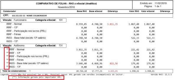 O relatório foi alterado para ler as informações geradas pelo importador XML e juntar com os valores calculados pelo RH3.