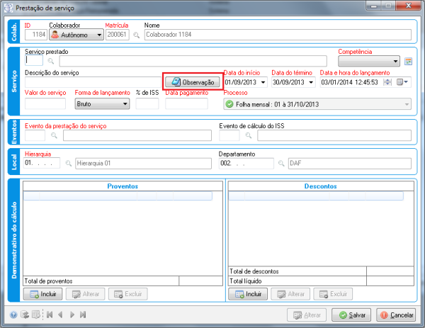 Caminho | Folha de pagamento→ Lançamentos→ Adiantamento de salário (vale) |