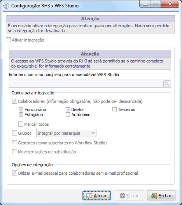 Caminho | Cadastros básicos→ Utilitários→ Configurações → Integração de dados RH3 x WFS |