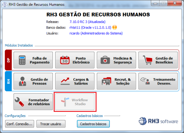 Descrição | Permite que o sistema RH3 possa realizar a integração de dados com o sistema WFS. ![]() Para maiores informações, clique aqui. Abaixo segue a chamada para o Workflow Studio. O botão estará: Habilitado: Quando as configurações de integração estiverem ativadas e o executável (WFStudio.exe) existir no caminho especificado; Desabilitado: Quando as configurações de integração estiverem desativadas ou o executável (WFStudio.exe) não existir no caminho especificado. ![]() |