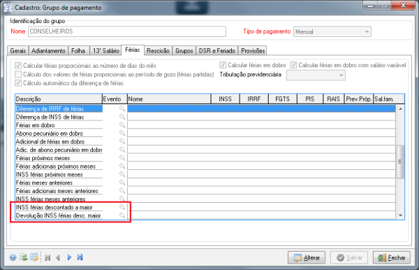 Descrição | Alteração no cálculo da folha para exibir diferença entre valor de INSS calculado em férias e o INSS calculado em folha, após reajuste salarial devido a mudança de faixa. Estes novos parâmetros estão no cadastro de Grupo de Pagamento. ![]() |