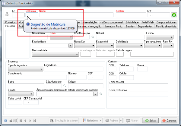 Descrição | Ao realizar inclusão do colaborador, o sistema exibe (sugestão) o código da matrícula automaticamente. Clique aqui para acessar a definição completa. ![]() |