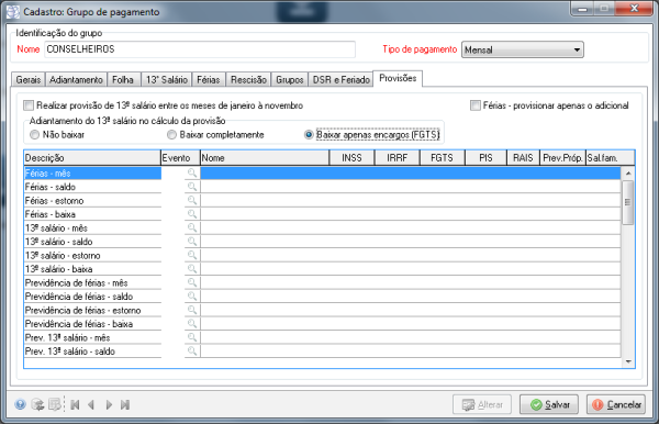 Caminho | Folha de Pagamento→ Tabelas→ Grupos de pagamento; Folha de Pagamento→ Processos→ Cálculo da folha→ Provisionar |