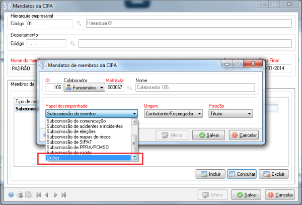 Descrição | No cadastro de mandato da CIPA, na inclusão dos Membros, na opção “Papel desempenhado” foi incluída a opção “Outros”. ![]() |