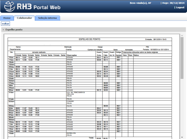 Caminho | PortalRH→ Visão colaborador → Espelho de ponto |