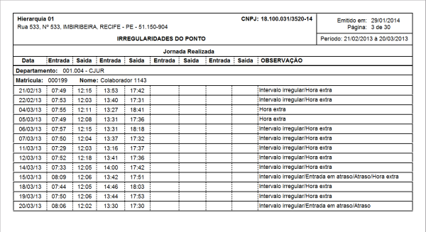 Caminho | Ponto Eletrônico→ Relatórios→ Relação de Irregularidades do Ponto |