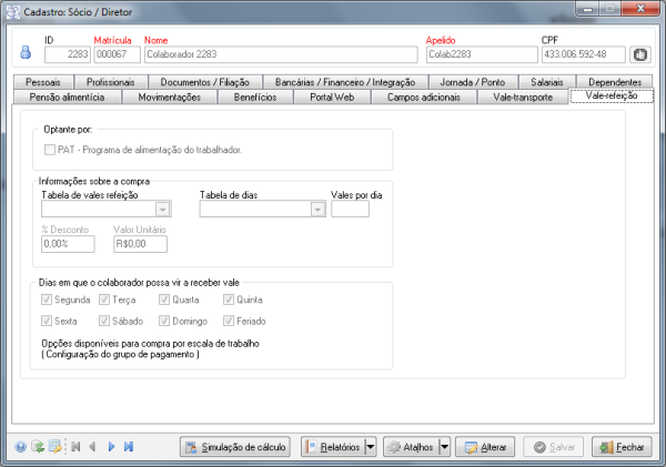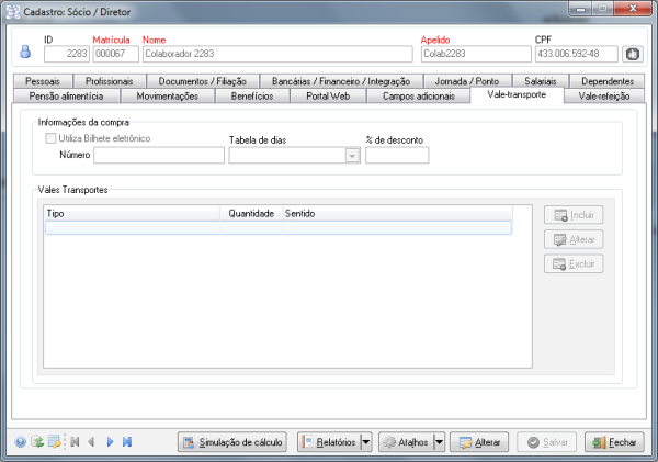 Descrição | Foram adicionadas as abas de Vale transporte/Vale Refeição para Diretor, assim como já existe na aba de funcionários. ![]() ![]() |