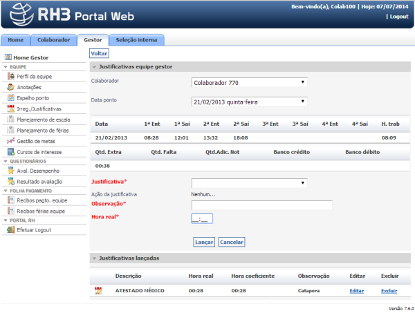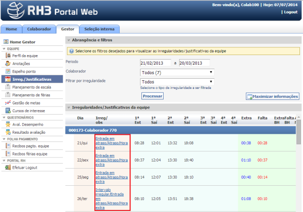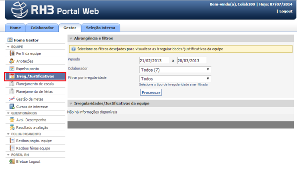 11273 - Disponibilizada tela de Irregularidades/Justificativas no portal RH, na visão do gestor