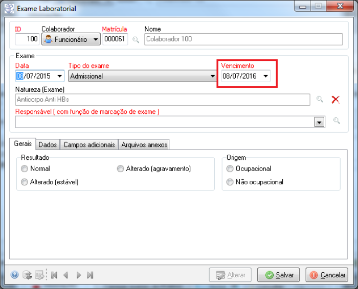 Descrição | O sistema foi alterado para sugerir datas de vencimento dos exames laboratoriais de acordo com a frequência definida nos exames vinculados ao PCMSO, Função ou Cargo. Ao incluir um exame, sugerir a data de validade de acordo com as regras definidas no PCMSO, Função ou Cargo do colaborador (caso não haja a informação no PCMSO), observadas as restrições de departamento, cargo, requisição, gênero e frequência. Caso não seja informado o período, nem no PCMSO e nem no Cargo do colaborador, deve-se sugerir o período de um ano. ![]() Para maiores mais informações, clique aqui |