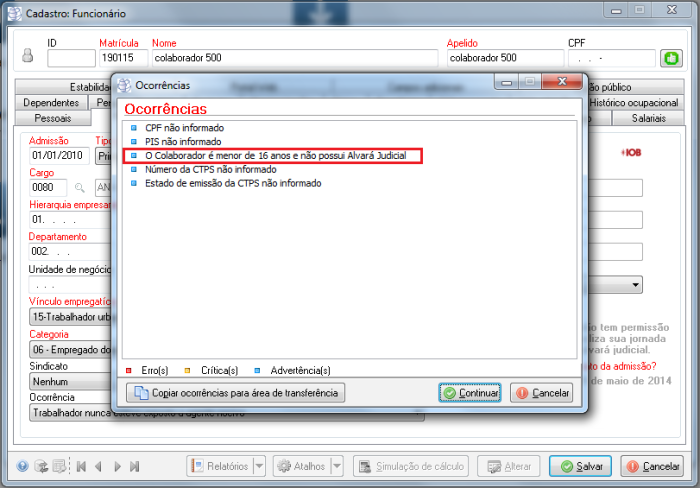 12419 - Adicionada advertência na admissão de funcionário/Servidor/Estatutário abaixo de 16 anos