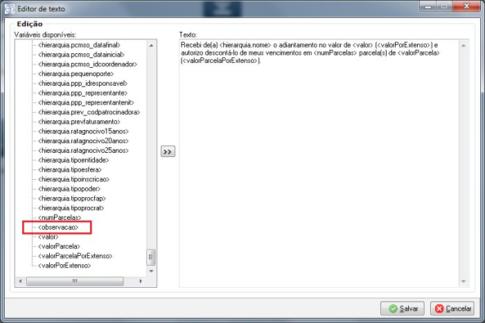 Descrição | Adicionado o campo “observação”, nas variável de composição do texto do recibo. ![]() |