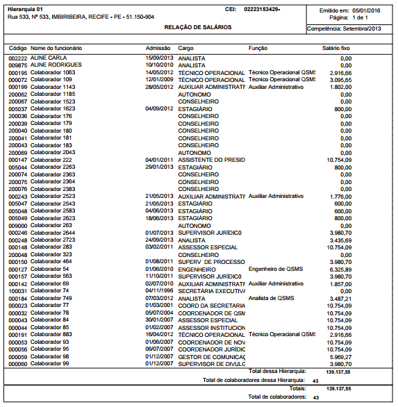 Caminho | Folha de Pagamento→ Relatórios → Quadro de horário de trabalho |