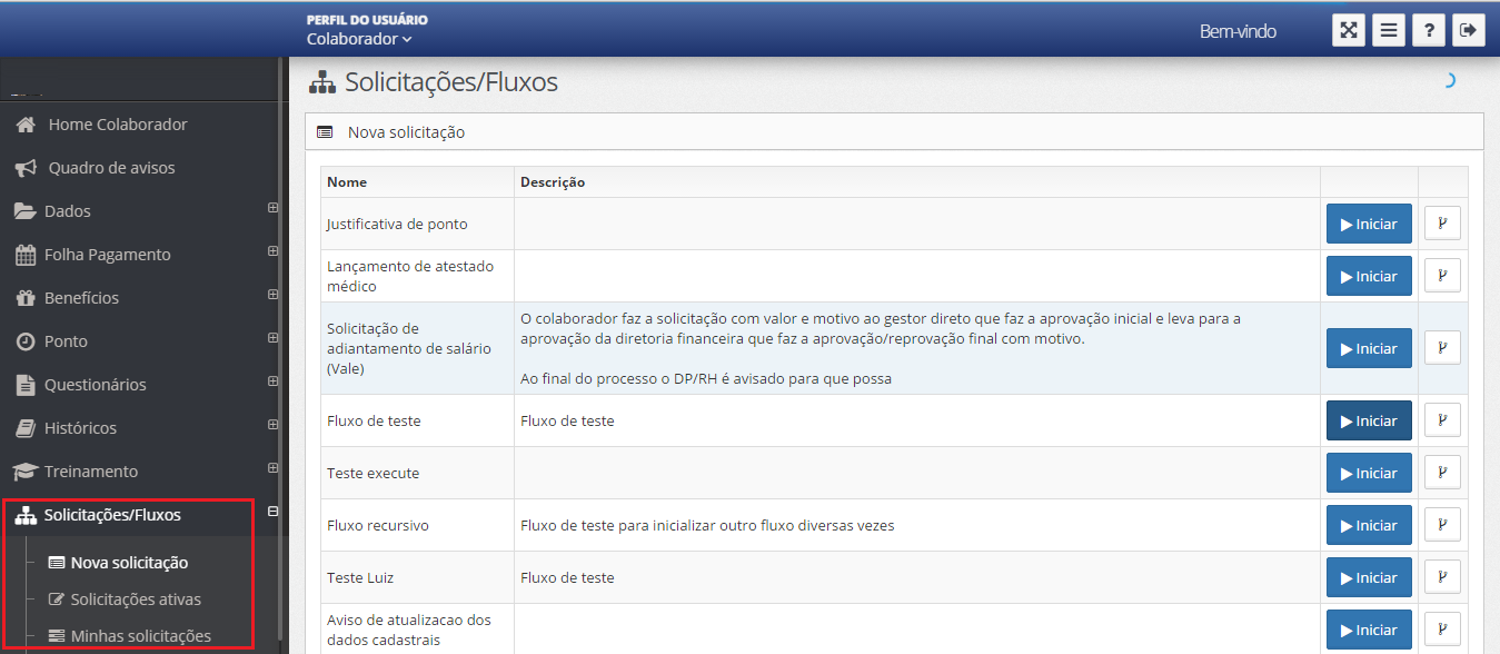 Descrição | Através desta funcionalidade é possível instanciar e interagir com fluxos através do Portal Web, ou seja, sem a necessidade de ficar trabalhando com os dois portais. O usuário deverá configurar no RH3 para que o usuário possa visualizar a funcionalidade em questão. ![]() Abaixo seguem as funcionalidades do WorkFlow disponíveis no Portal WEB (Visão colaborador) ![]() Nova solicitação Para maiores informações, clique aqui Solicitações ativas Para maiores informações, clique aqui Minhas solicitações Para maiores informações, clique aqui |