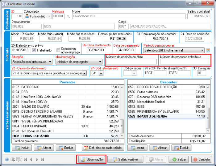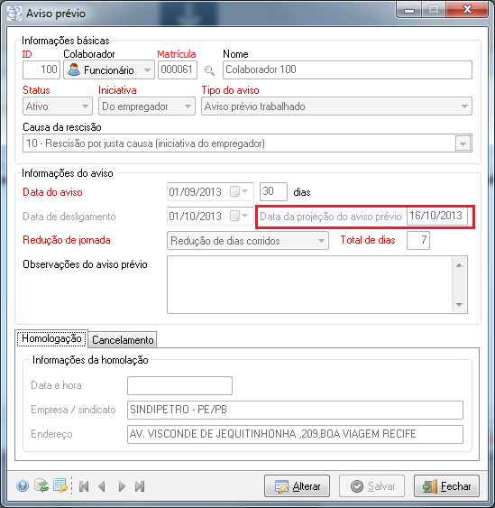 Caminho | Folha de Pagamento→ Processos→ Rescisão → Aviso prévio |