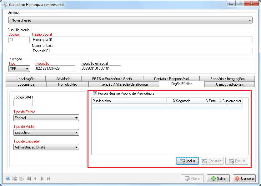 Caminho | Cadastros Básicos→ Cadastros→ Hierarquia empresarial |