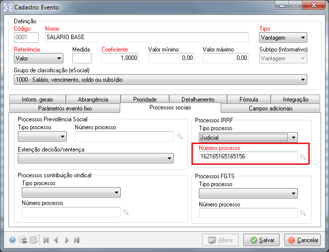 Descrição | As incidências dos eventos podem ser suspensas por determinação judicial. A fim de atender este requisito, a rotina de cálculo foi alterada para prever esta suspensão. Para que isto ocorra é necessário informar o número do processo que originou a suspensão. O número do processo é informado no cadastro de eventos, conforme imagem abaixo. ![]() |