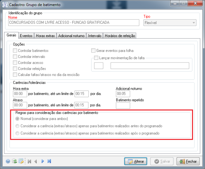 Descrição | Foram alteradas as regras para consideração das carências por batimento. Com essa alteração, ao processar o ponto, o sistema permite que a regra do “extras/atrasos” seja aplicada para as batidas antes do horário, depois do horário ou em ambos os casos. Para isso, foram incluídos os parâmetros abaixo: ![]() Para mais informações sobre a tabela de “Grupos de batimento”, clique aqui. |