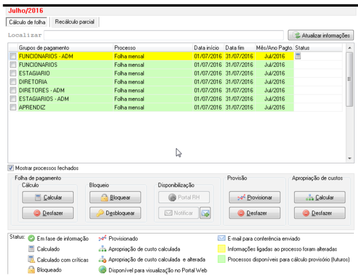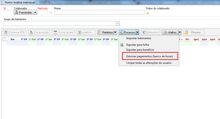 Caminho | Ponto eletrônico→ Tabelas→ Grupos de batimento; Ponto eletrônico→ Processos→ Processamento do ponto. |